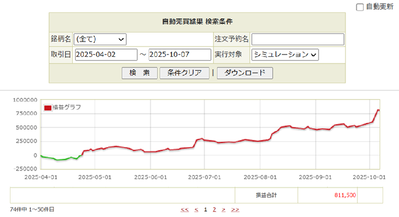 オートレのシミュレーション結果は2025-04-02~2025-10-07までで、総損益は811,500円でした。