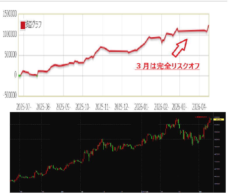 2026年3月の大きな価格下落変動局面では自動トレンド判定でリスクオフしています。